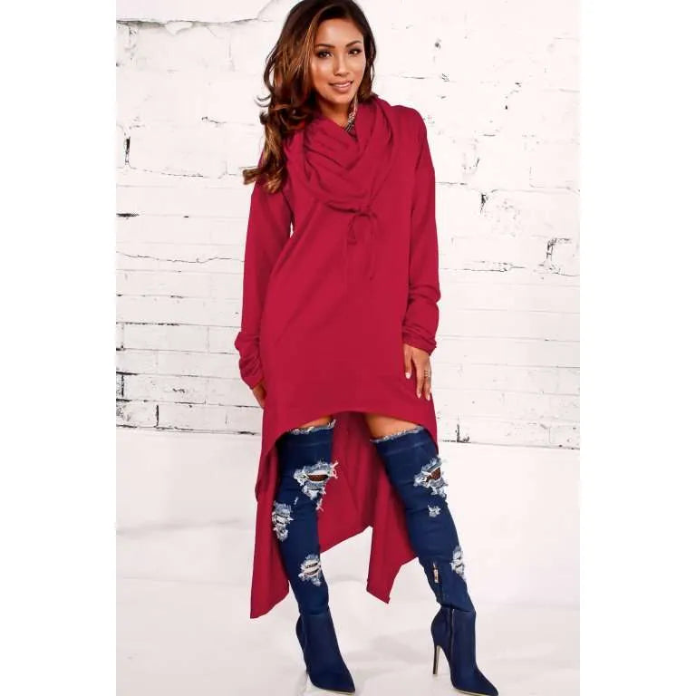 Transform into this chic and trendy asymmetrical hoodie. Equipped with a convenient front pocket and a versatile cowl neck that easily converts into a hood.